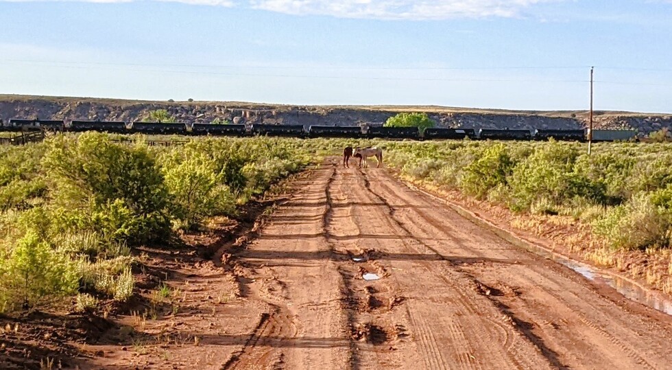 This picture captures the driving challenges in the areas near Petrified Forest National Park. Trains, livestock, mud, but the worst is private property/locked gates. I know from a previous visit two weeks ago that just down the road over the track crossing the road is gated. Today I was going to look if it was also posted No Trespassing. But the horses and mud made me turn around here and not waste my time. Half an hour later I saw (from a distance) a BNSF convoy with an excavator stopped here with the lead driver out negotiating passage with the horses.
