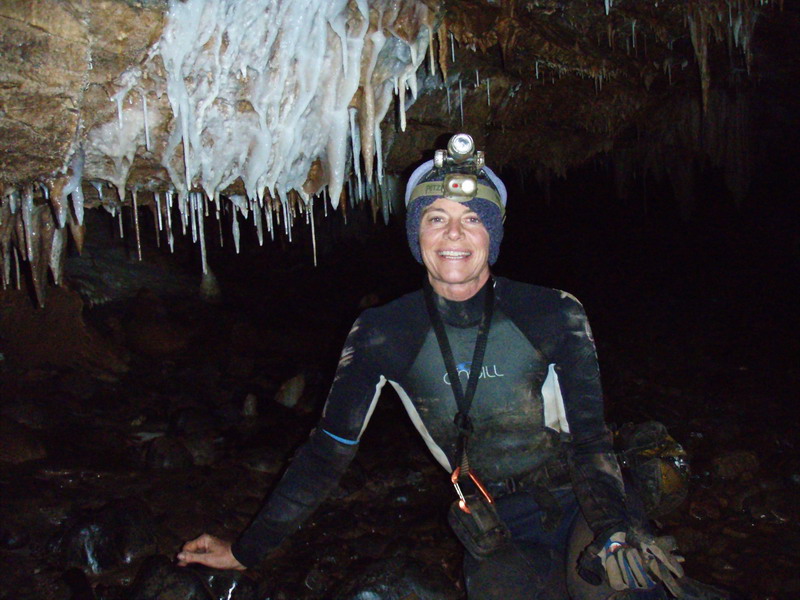 Me after we crawled, swam a sump in upper 40's degree water deep in this cave, I'm still cold in a full wetsuit, thermal underwear, neo socks, insulated gloves and a wool hat. I'm sitting on my helmet. This was an 8 hour trip. We had dry clothes on the other side of the sump. Air way about 4-8 inches for about 25 feet.