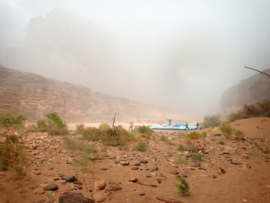 Less than 30 minutes later. Visibility got worse before it got better. You can barely see the outline of the big cliff across the river. The Guide in the Raft is looking straight out where Blacktail Canyon is.