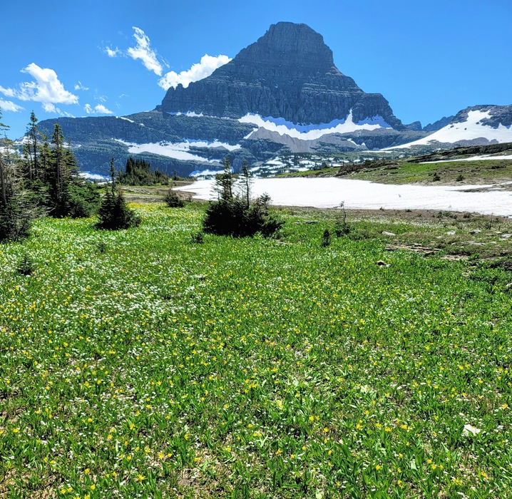 Another Glacier Lily and Western SpringBeauty flower field with Reynolds Mountain behind. Reynolds Mountain was named for a member of the "Forest and Stream" staff by George Bird Grinnell who was one of the pioneers influential in the establishment of Glacier National Park.