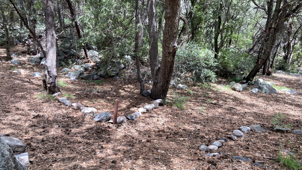 The fork. Arrow points to the falls. Left follows the obvious trail upstream.
