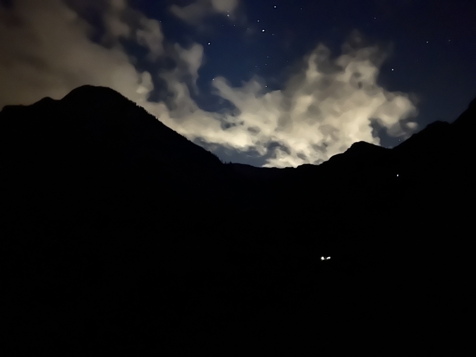 A few headlamps up above me, following my 4:45 am start, with the star-filled sky and the glow of some city lights on the other side of the mountain helping my camera capture the clouds.