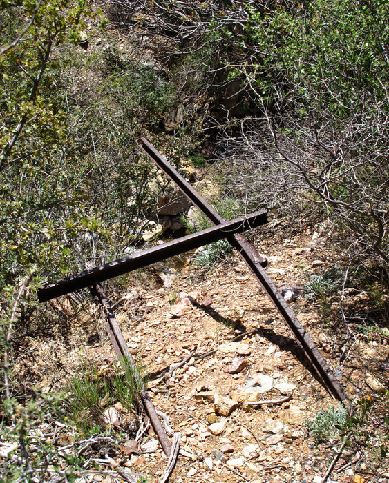Historic mining cart trackage extending out from portal of LOWER Sunnyside Claim Mine overhanging the mine tailing pile;