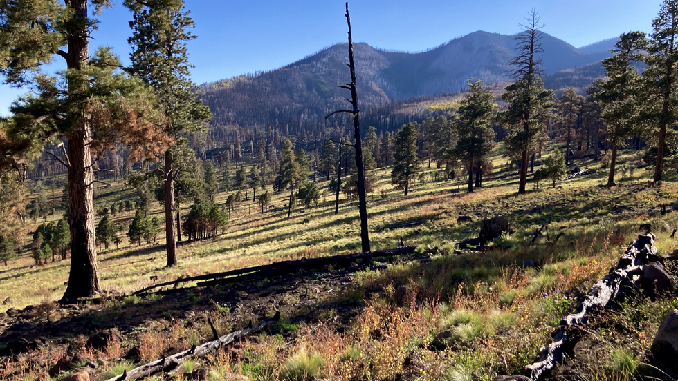 Healthy post-fire lower meadows looking up to the burned peaks 11060 and 10569.