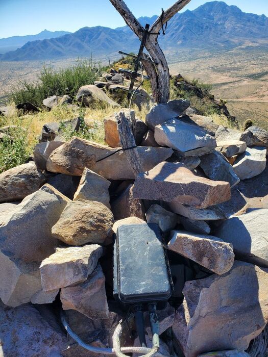At the high point looking at the rock pile containing a solar powered antenna, and registry. Kitt peak and coyote mountain to the South.