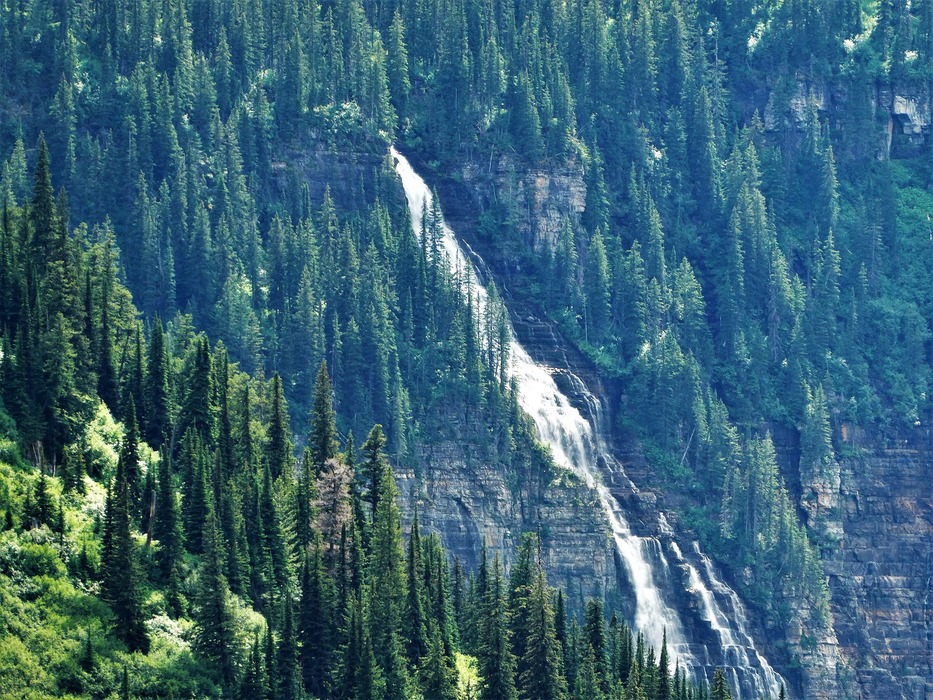 a zoom of the breathtaking Bird Woman Falls sculpted by a Glacier hundreds of thousands of years ago. This Glacier was also responsible for carving out the valley below Logan’s Pass as well as Lake McDonald. It is two miles from where we're viewing it.