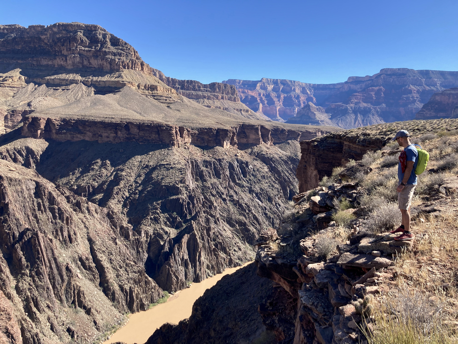 Ryan checks out some Tonto views from a near-vertical viewpoint 1000 feet above the river.