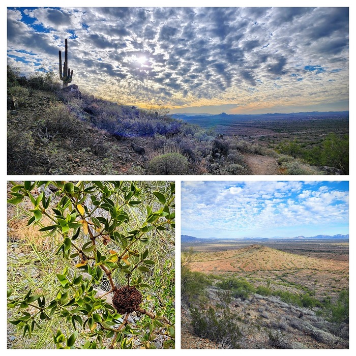 Top photo is coming down the northside of Ridgeback heading west. Such cool light in the background with the yellow from the sun's hue that you can somewhat see in the sky being caressed by the altocumulus clouds.