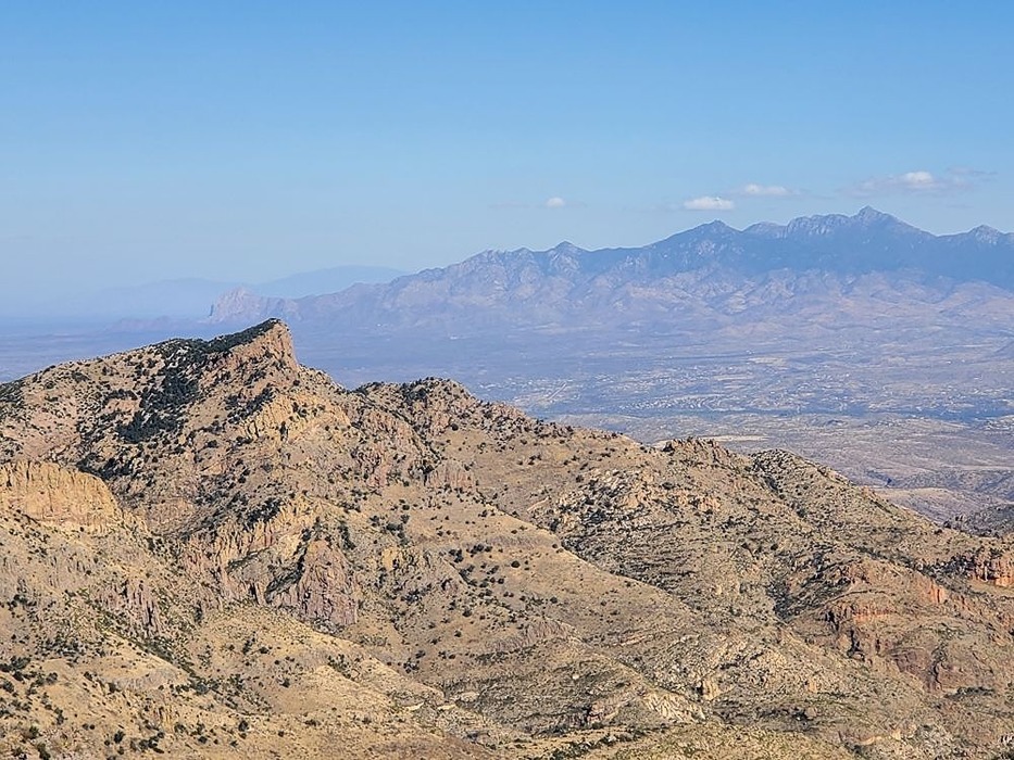 Ramanote peak is close up on the left side. In the distance we can see the Santa Rita mountains - Mt Wrightson, Mt Hopkins, and Elephant head way on the left side of that range.
