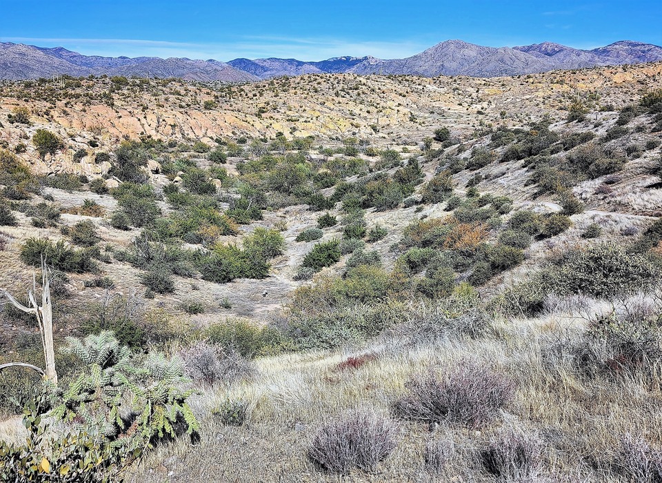 Looking to the northeast at the Gila Mountains. The grey plants in the foreground are all Wright's Buckwheat. There was a lot in this area.