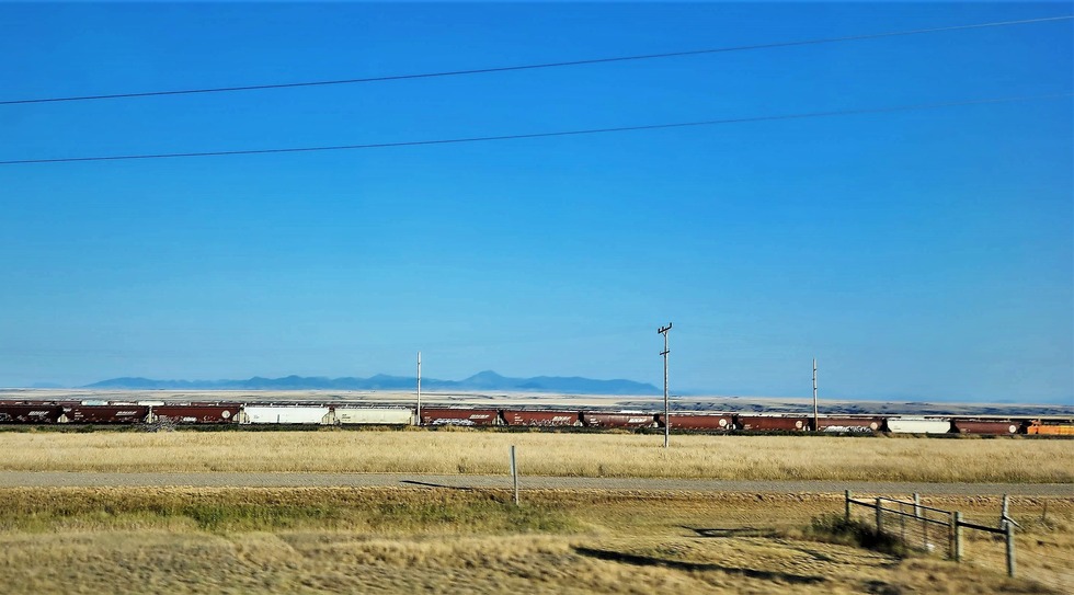 Day Six continued: Then while Connie was getting her nails done, I was dealing with T-mobile trying to upgrade my new Samsung Ultra 22 from 256 to 512; what an ordeal that all turned into because I was traveling and couldn't get my hands on a 512 (they didn't have one in stock, nor did the entire state of Montana according to the Great Falls store manager). I had to get a new phone because my phone had split due to an expanding battery. On our drive back to the ranch we got to pass by a long railroad train with views south to the Highwood Mountains that seemed as long as the train.