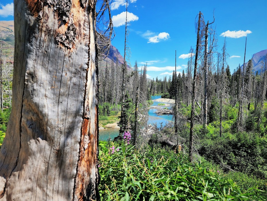 Looking past the burned trunk toward the turquoise waters of St Mary River as it flows toward St Mary Lake.