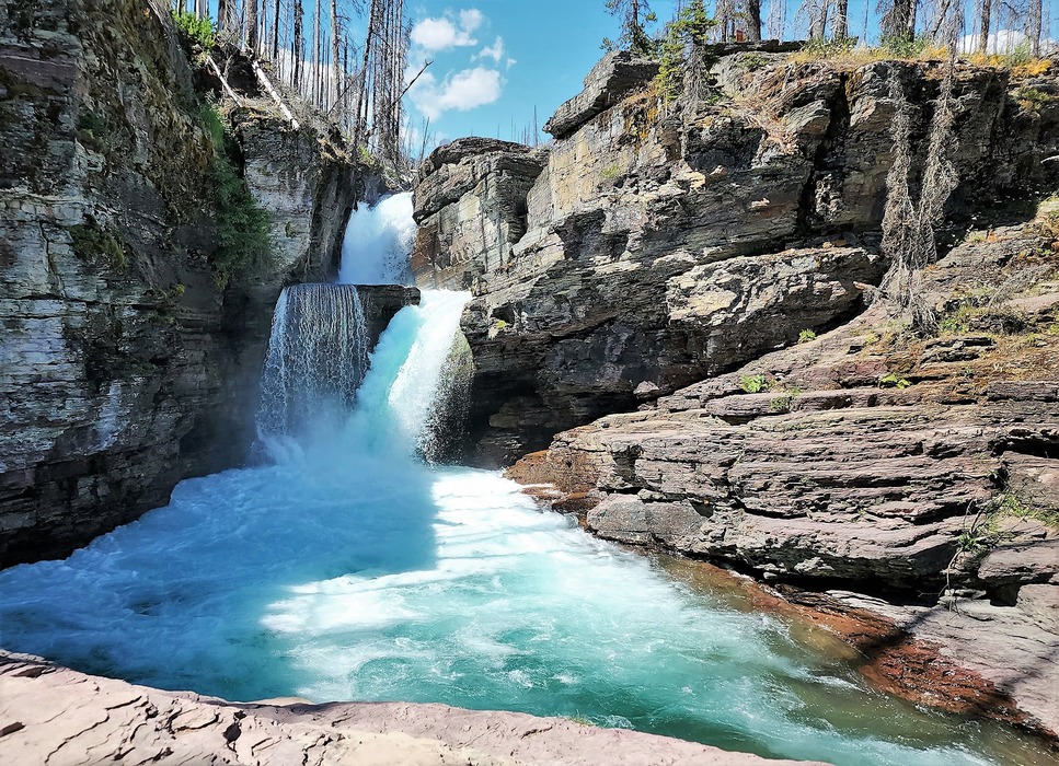 The falls sit within the canyon and tumble over three separate benches. Even in the peak of summer visitors to St. Mary Falls can hear the roar of the water tumbling down the rock.
