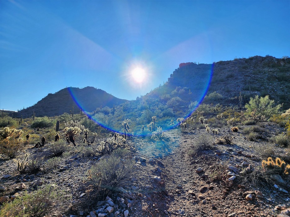 Heading up Quartz Ridge #8A to the southwest. Sun was hard to work with since it's so low but I liked the blue ring.