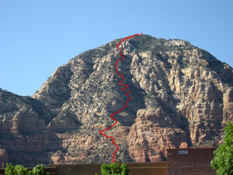 Not meant to be a trail map, but this thin red line gives you an idea of the trail route. A good deal of the lower section from the first pitch to the view point is on rock, and you'll have to pay close attention to how far west you get before you turn back east. Turn east before you get close to the rock face. The little break is the approximate area of the chimney.