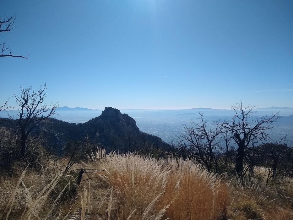 Much of the upper elevation burned area is recovering with heavy native grasses and lots of penstemon, too. Probably a lot of humming birds when they flower. Hazy, bad air in the basin. Inversion layer looks to be low, near Wrightson.