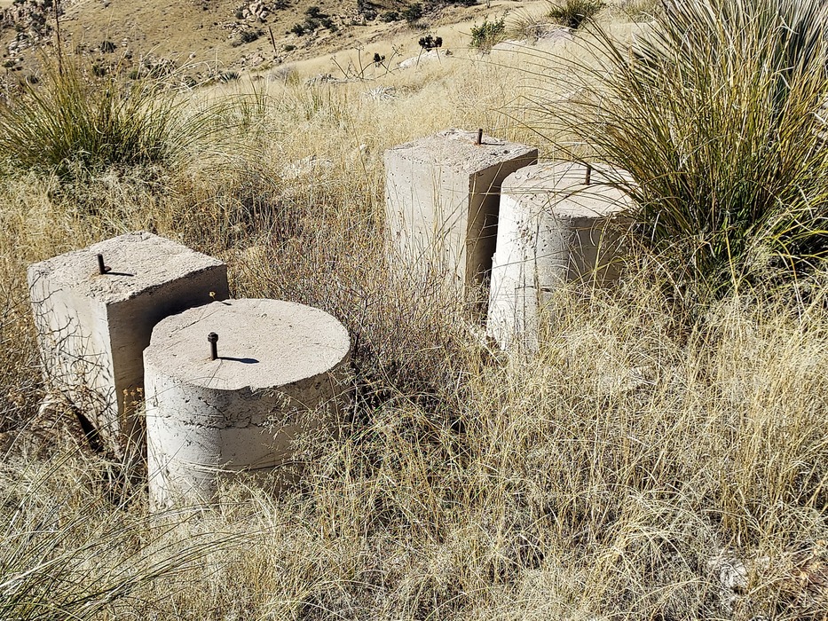 These are footings for an airway beacon that was once here. According to the NGS dataset, this particular beacon was 51 feet high and had a red course light that was 18 inches in diameter flashing the letter "U"(that's dot-dot-dash in Morse code). The main beacon light was was 24 inches in diameter and revolved 12 times per minute.