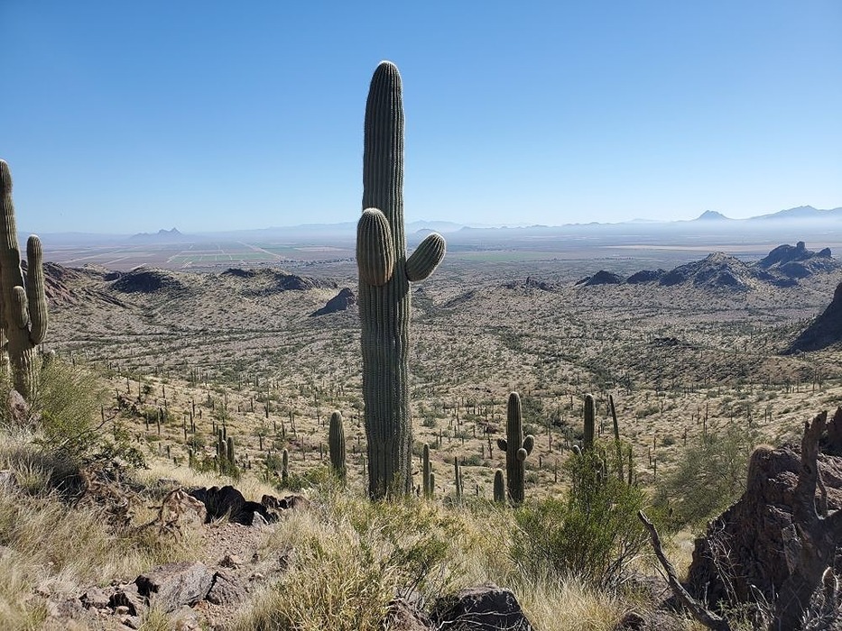 Looking down at huge saguaro from the main saddle. Picacho peak is on the left side of the photo.