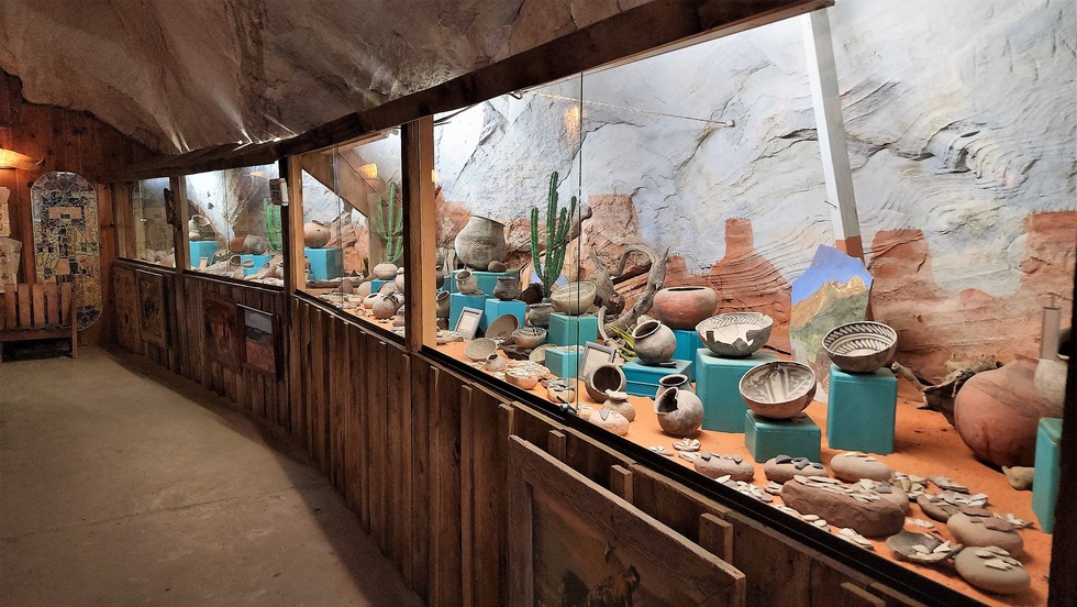 A sandstone cave museum was always in the Chamberlains’ sights as Garth studied geology, archaeology, and paleontology. The exhibits on display are his personal findings after years of studies and collecting. They include more than 1,000 arrowheads, ceremonial points, jugs, pots, bowls, and working tools from the Puebloan Era.