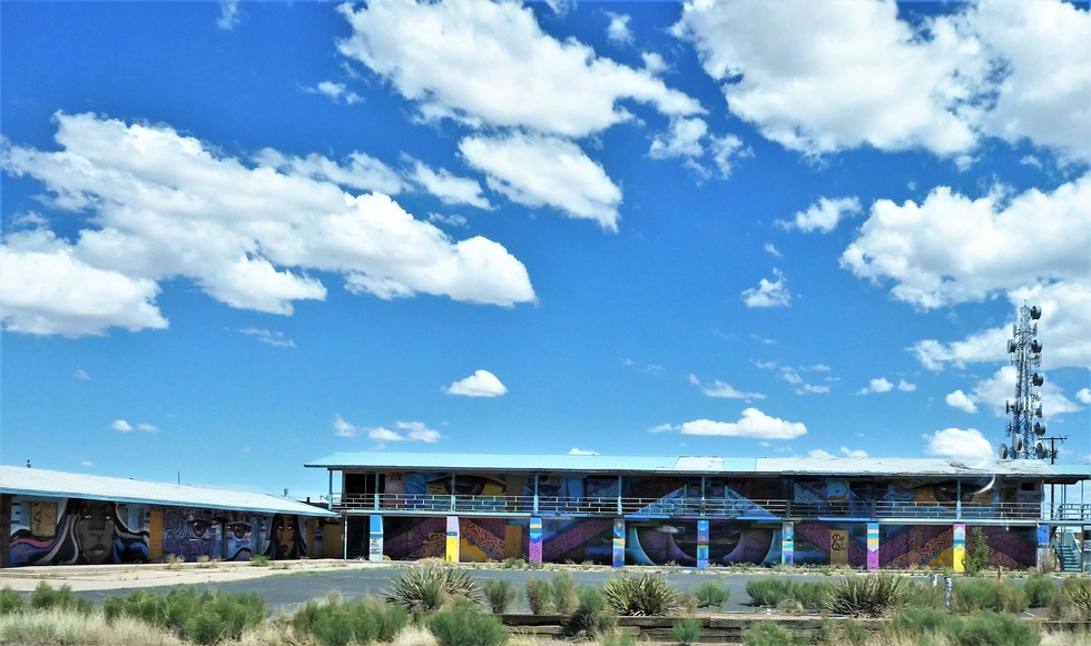 formerly the Anasazi Inn is now murals and carries a political message on the side of the building on the left side. I can't remember what it said now. It's apparently part of the Painted Desert Project.