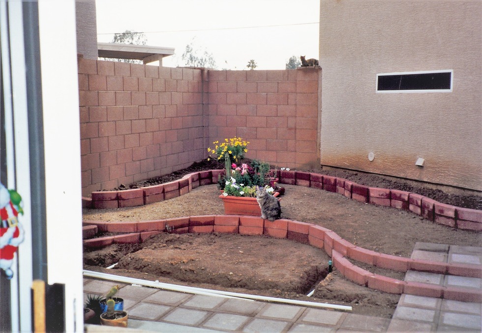 This is winter 1997 where it all began... around Christmas. That's Tibbora asking where is her grass. And now I see what the PVC was used for as they broke it a couple days ago and ended up ripping it out. I just now noticed a 'hood cat up in center of photo. I never noticed it before, ha!