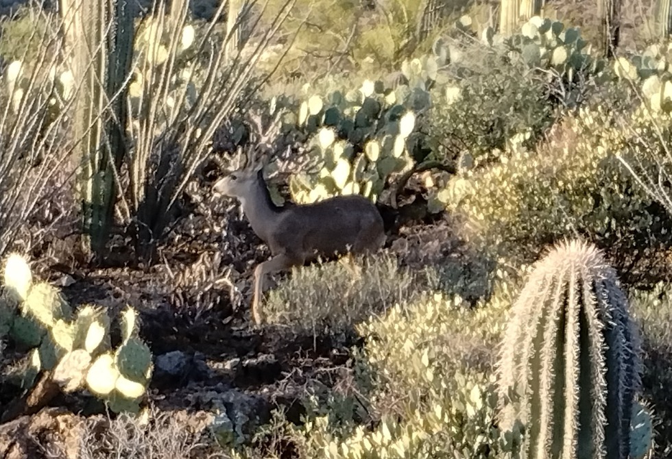 Over the past five or so years, I haven't seen much for wildlife anywhere in the Tucson mountains, but this guy seems to be a pretty regular visitor to the ECDC trailhead in the early hours these days. I think that the squatter who lives in the parking lot may be feeding it, as the thing seems to have little fear and maybe even a fondness for human presence. I should also note that it responds to "here kitty, kitty".
