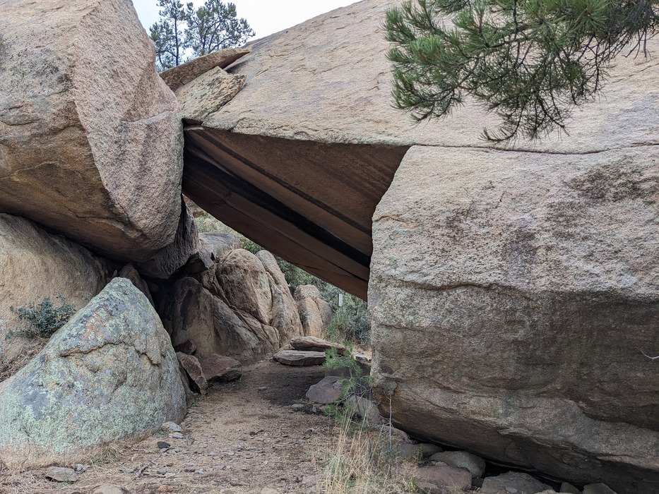 Natural rock house from north side. Sign is white rectangle in center of photograph.