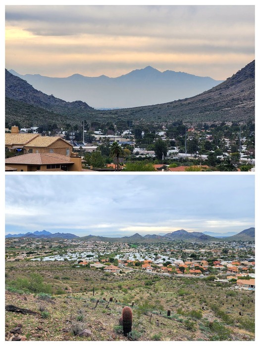 Bottom photo is looking south to the Phoenix Mountain Preserve in the left background. The inversion layer was also a little thick in the area to its south; just hard to tell in this photo.