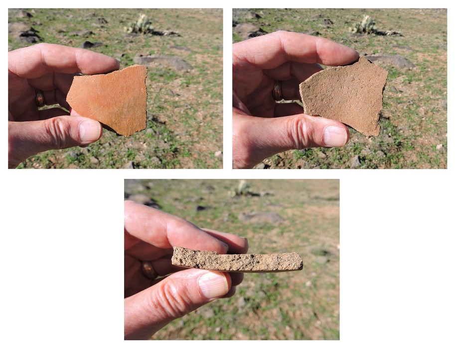 Lots of pottery sherds, especially near the 2 ruins. This one is typical of most of the sherds we saw.