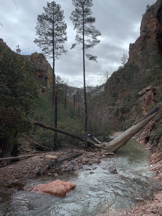Looking back toward camp, with snow on the north-facing slope of Rucker Canyon. The rugged wildness of the Chiricahuas is breathtaking, but not for the faint of heart.