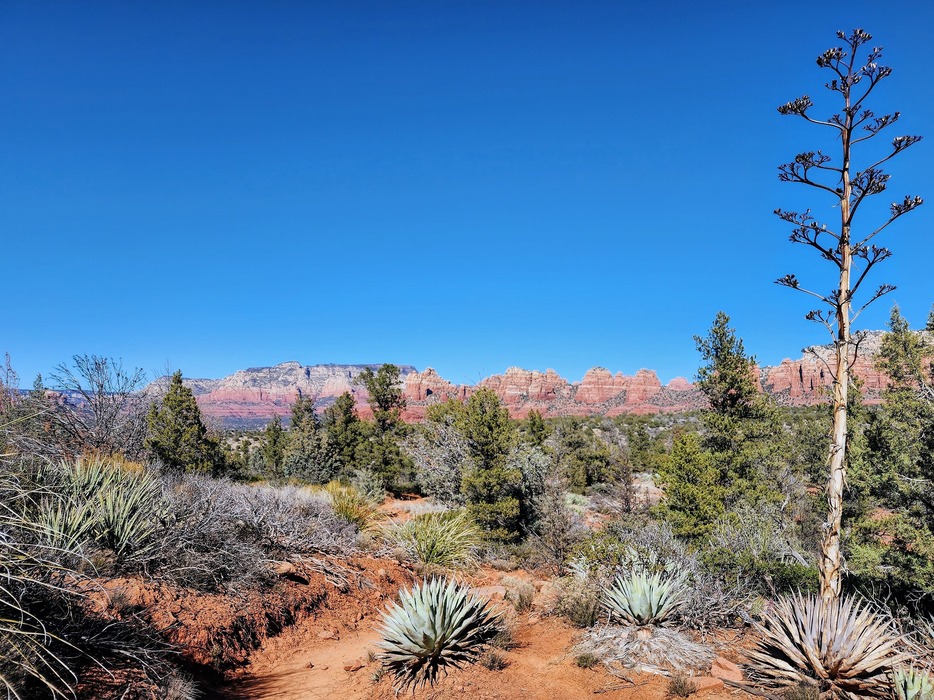 View to the NNE from Broken Arrow Trail. An expiring agave to the right. To see more