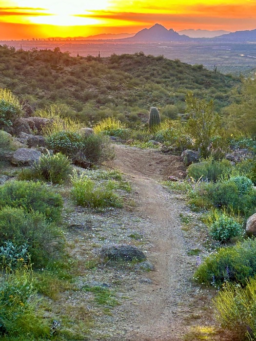 Camelback Mountain at Sunset.... Scenery from the Boulderdash Trail, Hawes System, Tonto Forest, Mesa Arizona. Spring Super Bloom 2023!