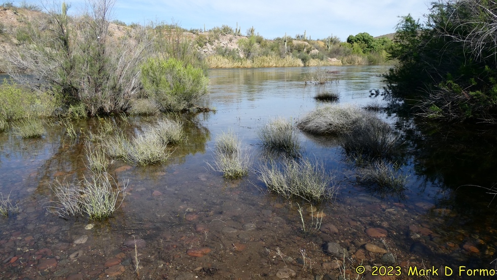 Salt River @ 7,900 cfs. (The tubing bus garages are to the left of the dark green tree along the horizon. 64.22 °F