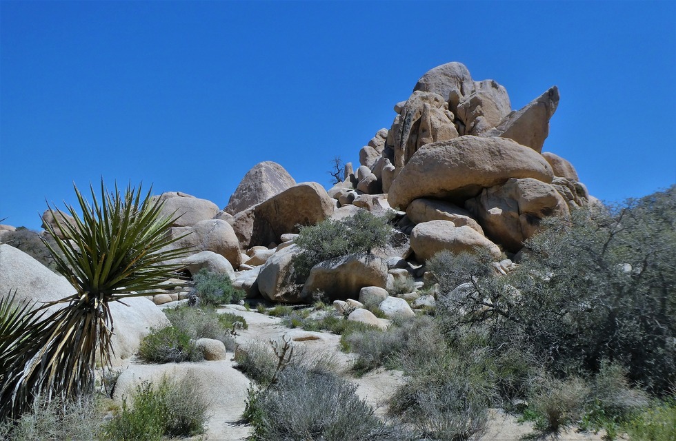 A large yucca on the left and some interesting boulders up on the right. Looks like something crashed.