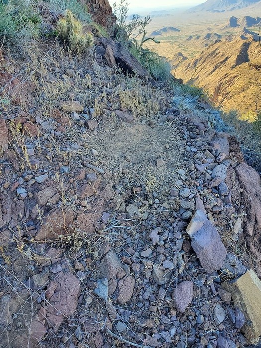 On a steep slope, heading down. Looks like here is where a bighorn laid down to rest.