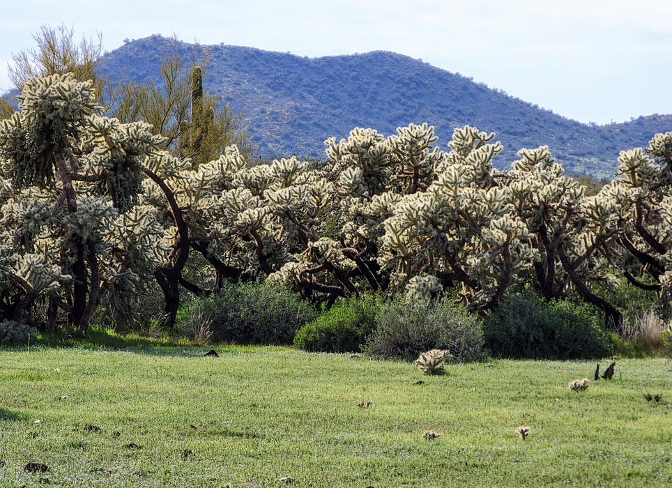 see the baby cholla in the groundcover and what a backdrop with the cholla and Apache Vista mountain.