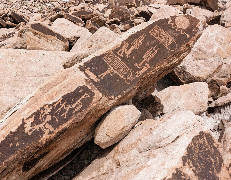 Really nice one included in Malotki's excellent book on the glyphs in the area "Tapamveni". Of this one he writes: "adorned with ritual scenes that involve the carrying of staffs and slab pahos or dance wands. Such ceremonial paraphenalia may have been featured in public performances similar to those still staged today at Hopi by the Maraw society. Basically a religious women's organization, it's initiated members wave so-called "Maraw prayer sticks" up and down in unison during their public performance. Note that the figures in both sections of the panel wear side hair bundles which identify them as female."