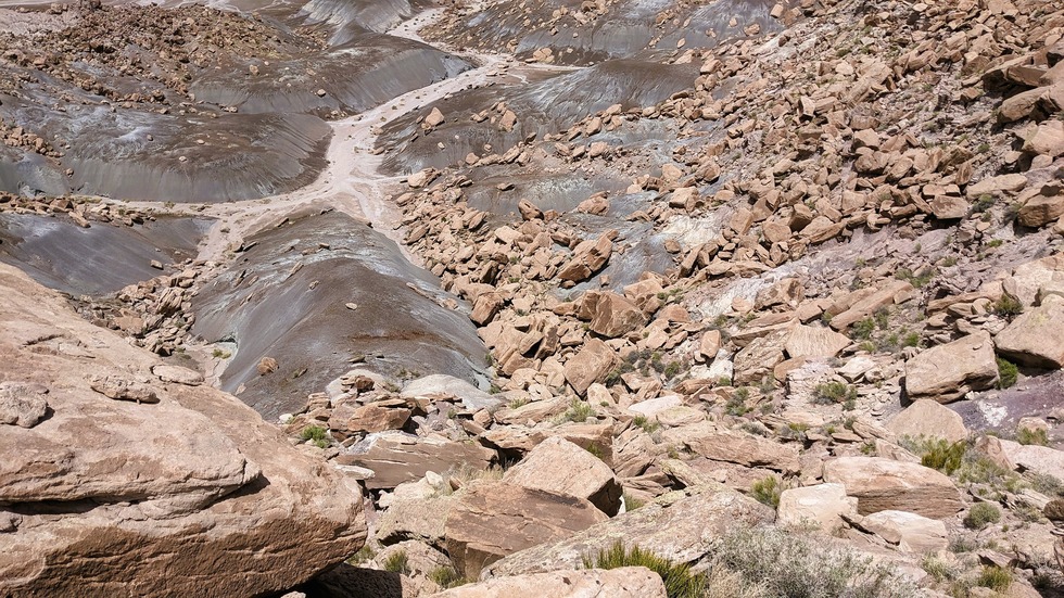 I spent much of my time on the mesa top worrying about how I was going to get down. I'd hoped the opposite side would provide a good way down but here it is - not inviting. (Those bare areas are worse than the rocks, steep and slippery.)