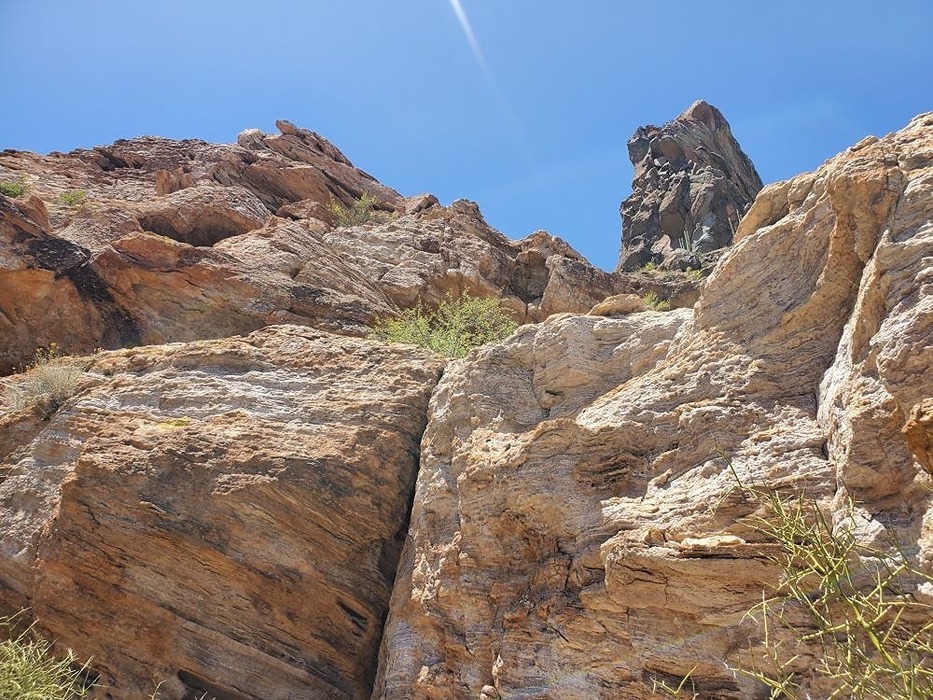 Looking up at some steep rocky cliffs. The peak is above all of this but there's an easier way around all this stuff.