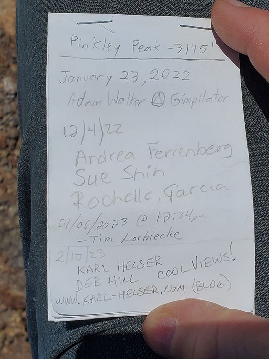 registry for Pinkley Peak, elevation 3,145 feet