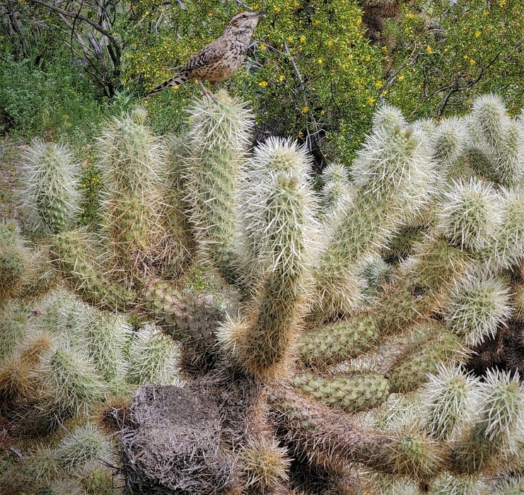 This photo has too much going on but it is what I saw. The cactus wren almost gets lost. There is a nest at bottom of the photo too.