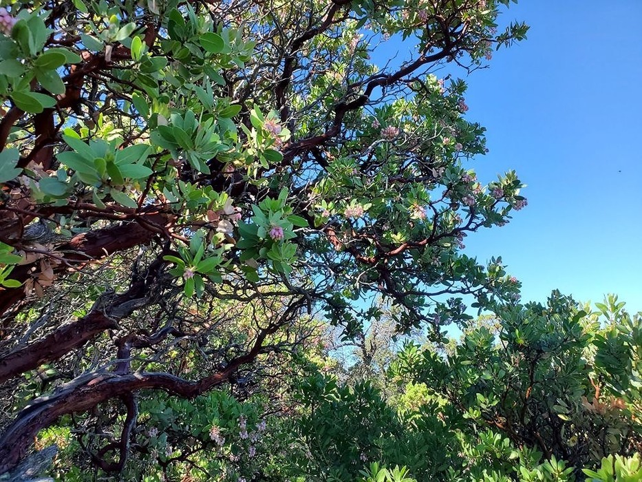 A huge manzanita tree with some branches reaching way over 10 feet tall. There's a pretty pink flower and then this tree produces many little apples (manzanitas, in Spanish). They are edible but they are usually pretty sour. I don't know when they ripen but it seems like every time we see these trees, the apples are green and not quite ripe yet.
