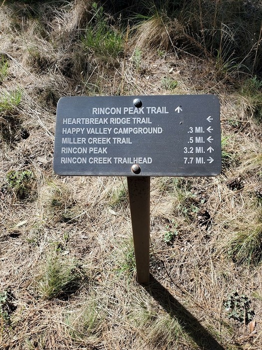Around 0.3 miles past the campground we ran into another junction. Rincon peak is 3.2 miles from here on the left split. Taking the right branch, it's 7.7 miles to the Rincon creek trailhead. Hiking from that trailhead would have added at least 6 miles to the roundtrip distance and would have made it nearly impossible to finish before dark.