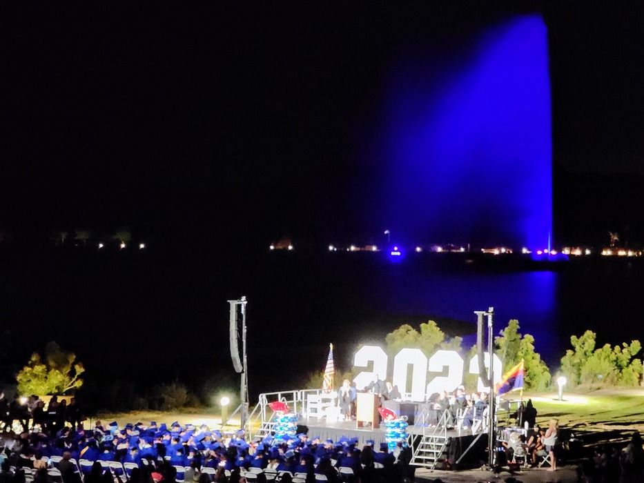 They had the fountain going for the entire ceremony and colored it Fountain Hills Falcons colors. I actually shot this in slightly zoomed portrait mode. I like the way it turned out.