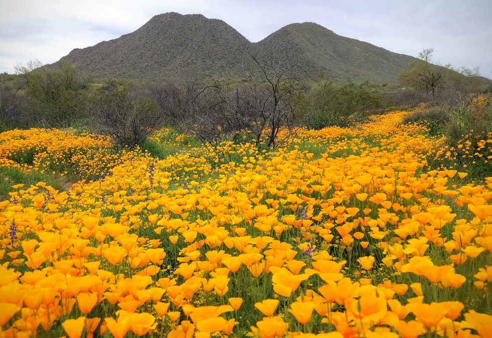 Butcher Jones road (north side). Looking over the superbloom of poppies toward Stewart Mountain.