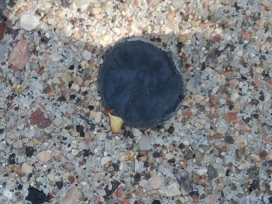 Looks like an old coin, maybe a penny, that was set in the stone at the peak