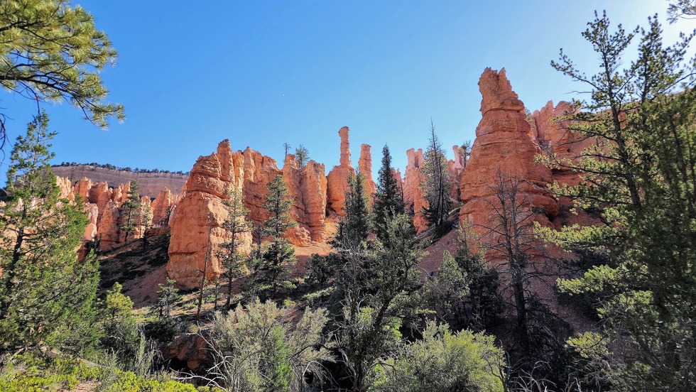 As I'm heading back, a better view of these hoodoos. Water, ice and gravity are the forces at work in Bryce Canyon National Park. These three forces coupled with the differential erosion of the Claron Formation produces a different morphology than that of any other area in the world.