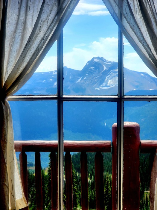 The view from our window of Room No 6, the first time I've got to stay in the front of the Chalet. And, of course, the weather was not the best. It was very windy this nite and tomorrow it would be even windier and very cold. But one can't complain when you wake up to Heavens Peak and you're not in heaven yet.