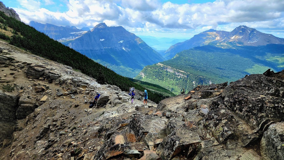 Deborah is trying to get a picture of Mary and Walker as they had to leave. Walker didn't like the wind and believe you me; where they are standing it is blowing really hard. In the distant background is McDonald Lake with McPartland Mountain and Heavens Peak to its right. To the left are some peaks sticking up in far background in back of Clements and Cannon.