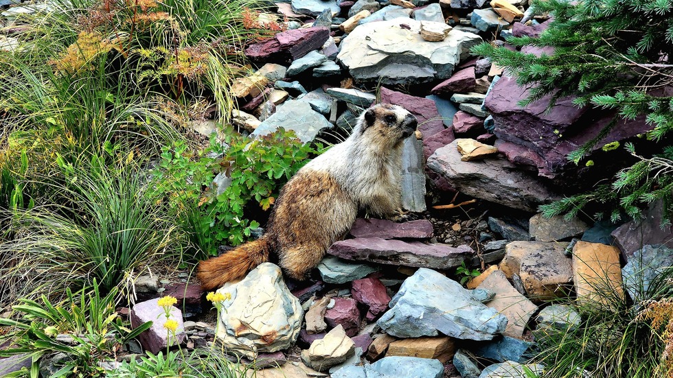 Finally got to see a marmot. And aren't the rock colors fabulous! I filmed it for a bit too. Tomorrow we will see a few of them on the Swiftcurrent Trail. I'm on the Highline now. Check out my video to see more [ youtube video ]
